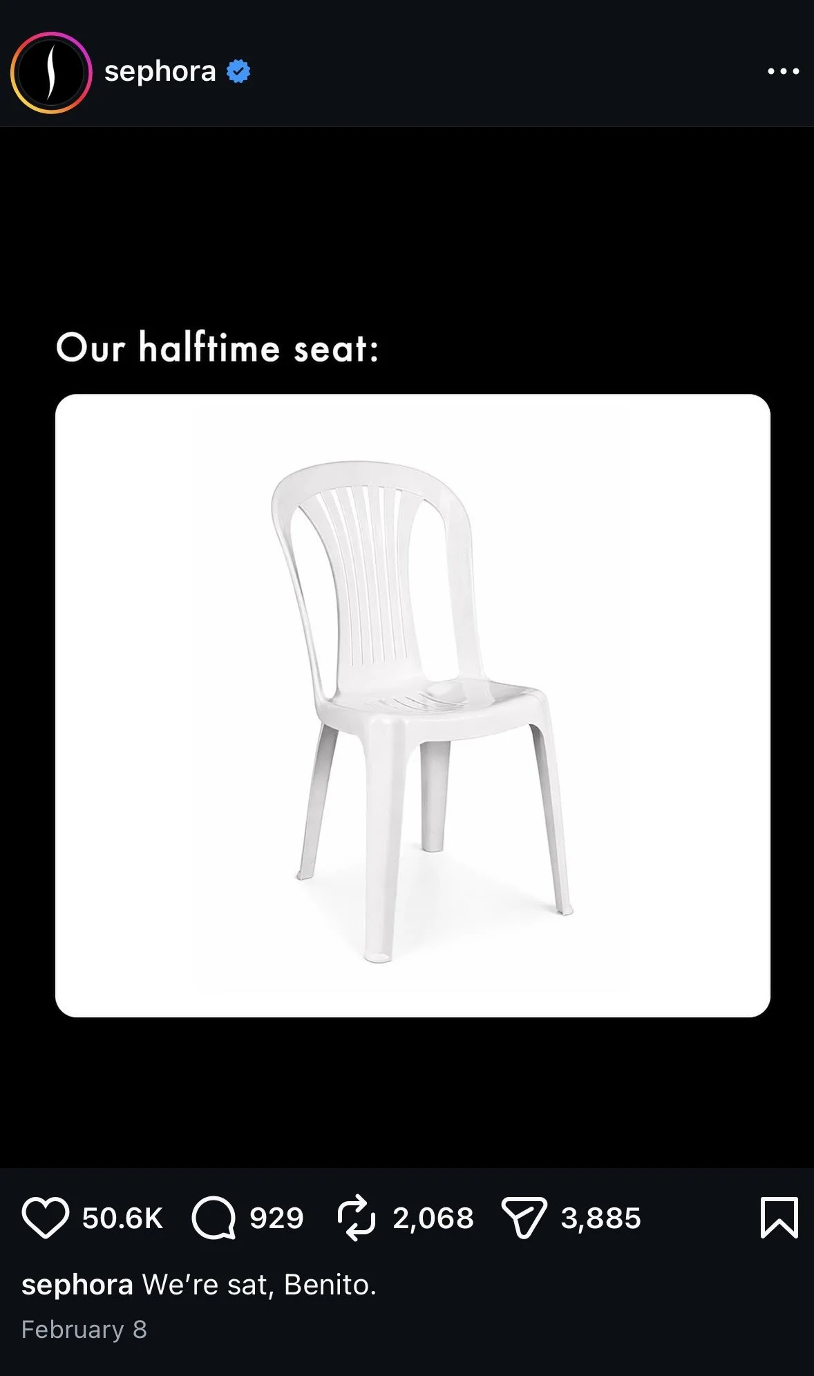 We worked closely with the client to shape the concept, ensuring it aligned with their brand voice while still pushing them to lean into culture more boldly. The post went live across multiple platforms on Super Bowl Sunday, positioning Sephora within a broader cultural conversation, not just a beauty one.